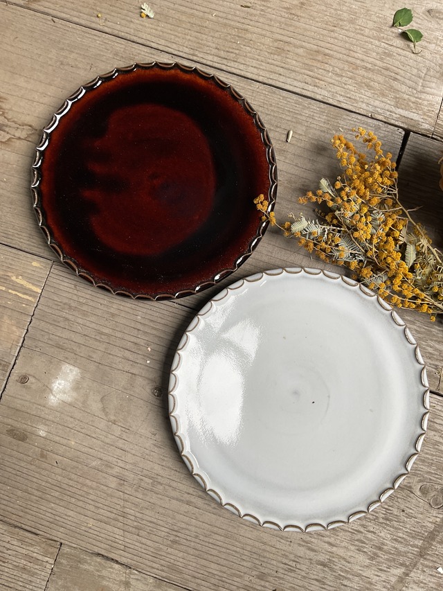 指で淵を押しレースのように仕上げた平らな皿です ケーキをはじめシックにかわいく演出してくれます size径19.5センチ 高さ2センチ